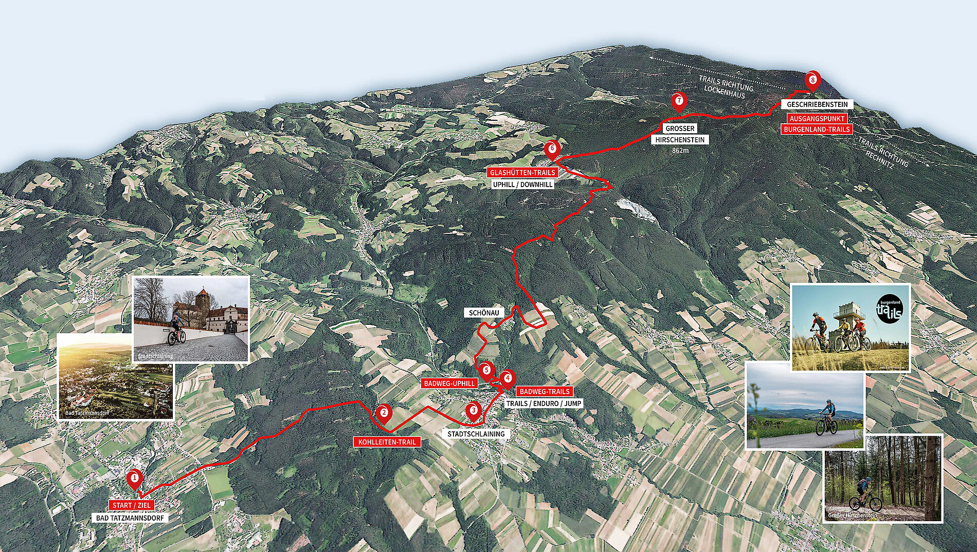 Die Mountainbike Route Burgenland-Trails ist ein Rad-Wegenetz für Gravelbiker, Tourenfahrer, Cross-Country-Biker mit sieben Singletrail Abschnitten. Außerdem ist die Route die direkte Verbindung von Bad Tatzmannsdorf über Stadtschlaining zu den Burgenland-Trails am Geschriebenstein.